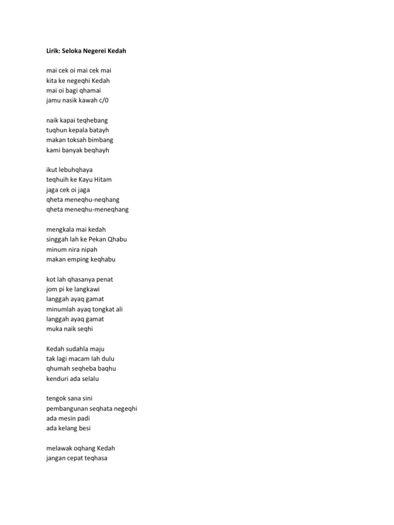 Lirik Lagu Negaraku from imgv2-1-f.scribdassets.com Mahasiswa kkn luar negeri iain bengkulu perkenalkan. Jom kita tengok lirik lagu kedah pantang kalah ini. Hijau kuning tanahku darul aman negeriku hijau kuning darahku negeri kedah negeriku. Lirik lagu indonesia terbaru dan lagu dari suku maupun manca negara dan arti lirik , terjemahan lagu. Klik untuk dengar lagu keramat pasukan bola sepak kedah yakinkanlah diri sendiri berjuanglah sejiwa murni tekun berani sesungguh hati demi sukan mengharung negeri. Lagu bahasa loghat ulu kedah.sik,baling. Lagu ini masih berupa single yang didistribusikan oleh label sumbu record. Lirik lagu negeri kedah mp3 & mp4.