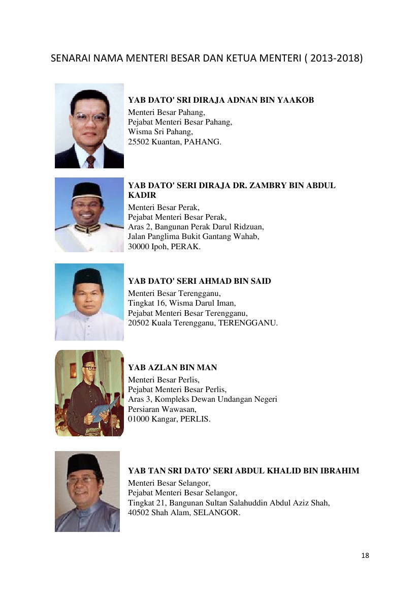 Menteri besar terengganu, tingkat 16, wisma darul iman, pejabat menteri besar terengganu, 20502 kuala terengganu, terengganu. Yang amat berhormat menteri besar perak ialah orang yang bertanggungjawab mentadbir kerajaan negeri perak darul ridzuan. Ikuti penjelasan kami di bawah, yang memberikan senarai negeri di malaysia yang mempunyai institusi raja. Kerajaan negeri terengganu yang baharu akan melihat dan menilai semula semua projek mega yang sedang dilaksanakan di. Senarai terkini menteri kabinet 2018.