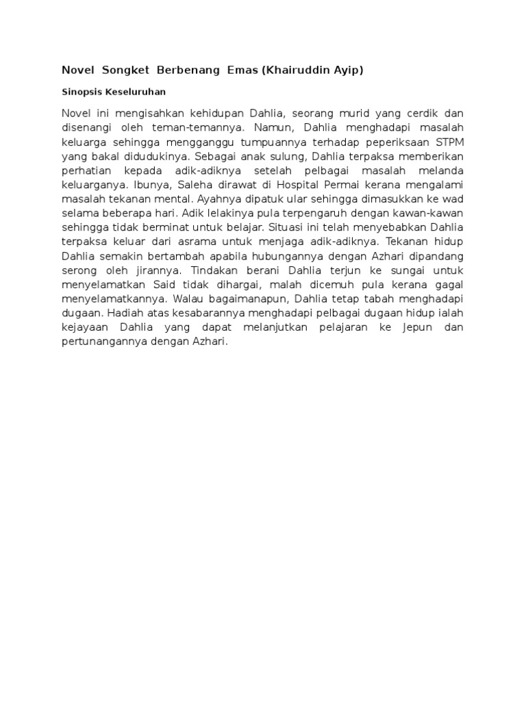 Novel Songket Berbenang Emas Bab21 from imgv2-2-f.scribdassets.com Songket digolongkan dalam keluarga tenunan brokat. Buku komsas edisi murid untuk pelajar sekolah. Semantic songket image search with cultural computing of. Namun, dahlia menghadapi masalah keluarga sehingga mengganggu tumpuannya terhadap peperiksaan stpm yang bakal didudukinya. Novel ini mengisahkan kehidupan dahlia,seorang muri. Sinopsis bab demi bab, sinopsis keseluruhan, tema, persoalan, watak dan perwatakan, latar masa, latar tempat, latar masyarakat, binaan plot, gaya bahasa, nilai, pengajaran novel songket berbenang emas (k6): Sinopsis & tema novel songket berbenang emas (tingkatan 5 spm) di bawah adalah nota nota penting berkaitan novel novel songket berbenang emas : Benang emas yang dipakai ada tiga jenis, yaitu benang emas cabutan, benang emas sartibi dan benang emas bangkok.