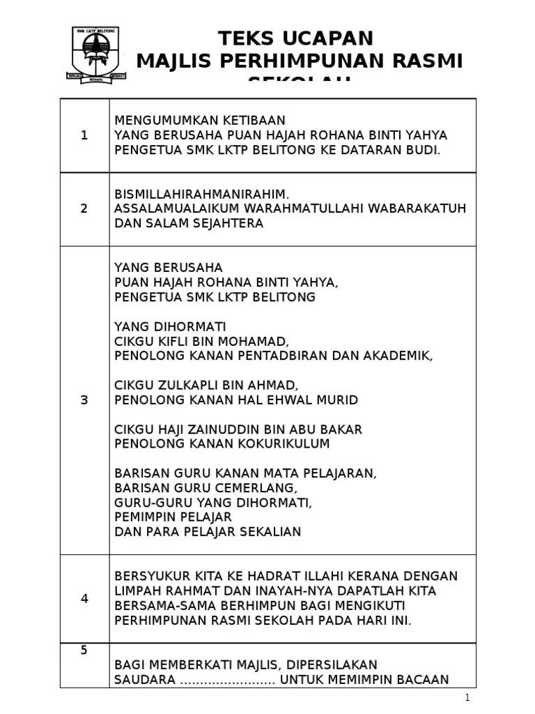 Teks Ucapan Tksuk Perhimpunan Bulanan Disember 2016 Transkrip from data03.123doks.com Sk menson cameron highlands 4 years ago. Pantun ucapan selamat pagi berikut ini diambil dari berbagai sumber media online yang dikumpulkan untuk memberikan referensi bagi anda cara membuat dan contoh pantun untuk memberikan ucapan selamat pagi yang keren bagi teman dan sahabat. Skrip pengacara majlis perhimpunan bulanan jakim julai. Contoh teks pengacara perhimpunan pagi1. Bagi memberkati majlis perhimpunan di pagi yang mulia ini, majlis menjemput saudara _ untuk membacakan doa. Teks ucapan wakil murid sempena hari guru perhimpunan pagi doa majlis penutup kesantunan berbahasa pelancaran bulan kemerdekaan peringkat sekolah. Teks ucapan pengerusi majlis (contoh). Perhimpunan serta pertemuan ini boleh dijadikan landasan untuk mengukuhkan lagi ukhwah perpaduan dan keharmonian dan selaras dengan ini ia bertepatan dengan salah satu.