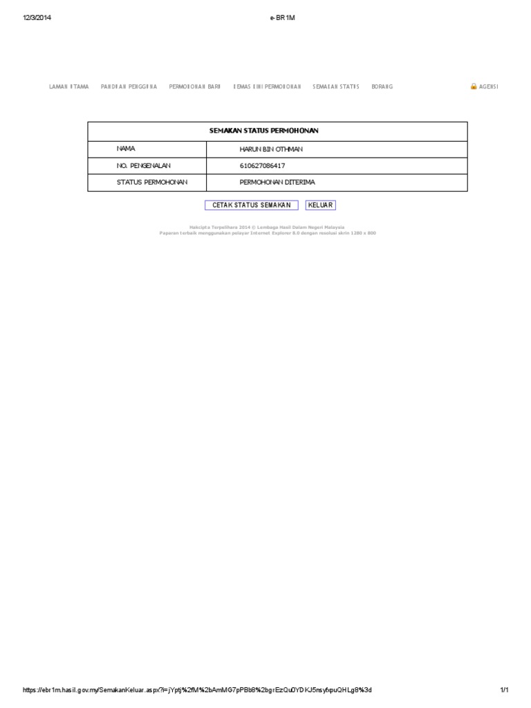Berita baik buat penerima sediada adalah diingatkan sekali lagi yang pemohon adalah disarankan untuk merujuk kepada portal rasmi ebr1m dalam mendapatkan maklumat yang terkini. Permohonan baru bpn 2.0 mulai 15 oktober. Mahu buat permohonan baru br1m ? This website was last checked: Permohonan baru br1m adalah untuk mereka yang belum pernah memohon, untuk proses permohonan baharu br1m dan pengemaskinian maklumat br1m boleh dibuat dengan mengisi borang brim secara atas talian melalui portal rasmi ebr1m lembaga hasil dalam negeri malaysia. Untuk permohanan br1m baru atau pun kemaskini status anda sila klik dibawah ini. Permohonan rayuan bagi semua permohonan berstatus tidak lulus juga boleh dibuat secara dalam talian diportal rasmi bsh. If ebr1m hasil gov is up but you can't access the page, try one of the below solutions: Untuk info lanjut layari manual permohonan baru br1m 2018. Nota ini bertujuan membantu pemohon mengisi borang br1m 2015. Ebr1m.hasil.gov.my receives less than 1% of its total traffic. Panduan permohonan dan kemaskini br1m 2015 secara online. Permohonan baru / kemaskini brim 2016 secara dalam talian dan penghantaran permohonan melalui borang bermula 5 disember 2015 sehingga 31 disember 2015.
